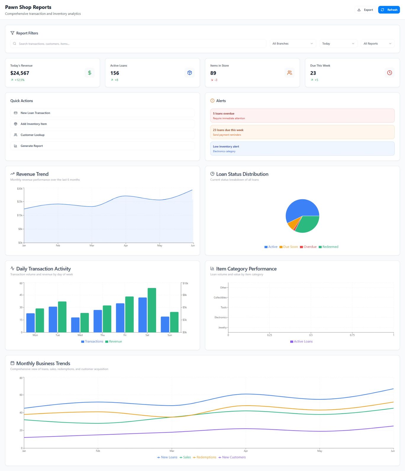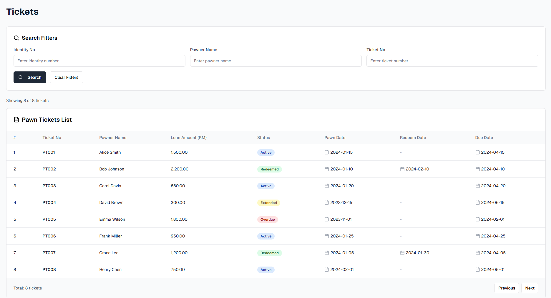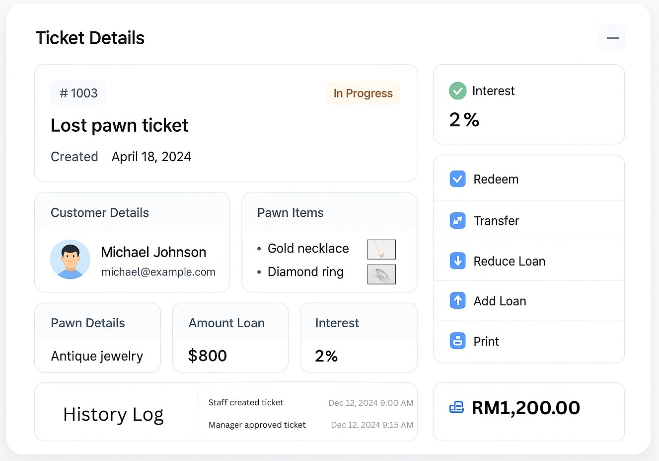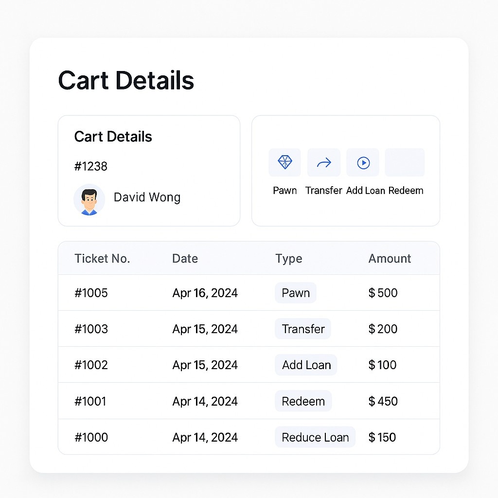 The ticketing system is a key component of PMS, designed to store and track all pawn tickets. With rich and detailed transaction history, it transforms the traditional pawn business into a fully digitalized experience.